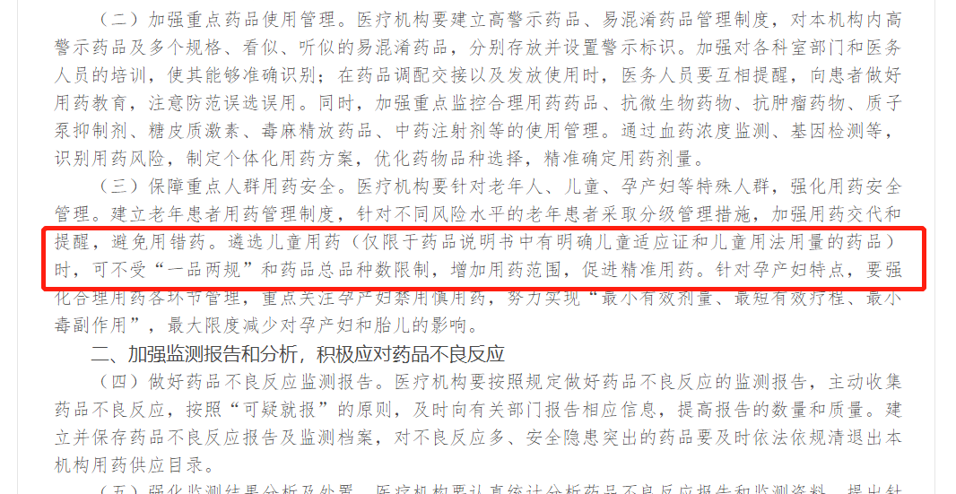 保障重点人群用药安全。医疗机构要针对老年人、儿童、孕产妇等特殊人群,强化用药安全管理。建立老年患者用药管理制度,针对不同风险水平的老年患者采取分级管理措施,加强用药交代和提醒,避免用错药。遴选儿童用药(仅限于药品说明书中有明确儿童适应症和儿童用法用量的药品)时,可不受“一品两规”和药品总品种数限制,增加用药范围,促进精准用药。